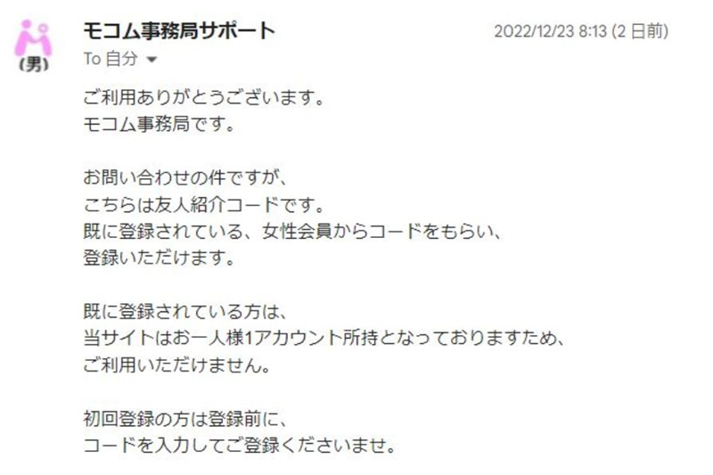 モコムの招待コードは女性会員からコードを貰う必要があります。